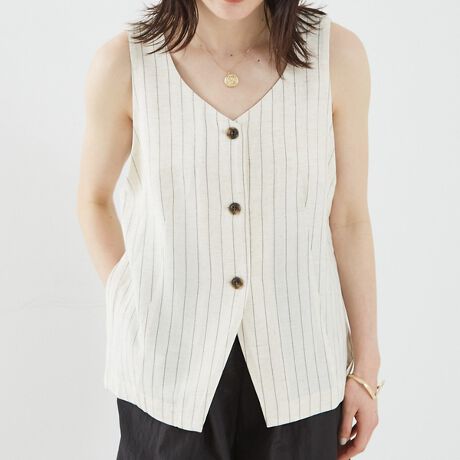1枚でもレイヤードしても様々なスタイリングが楽しめるベスト。程よいコンパクト感で単品で肌見せしたい時もセクシーになりすぎない印象に仕上がります。