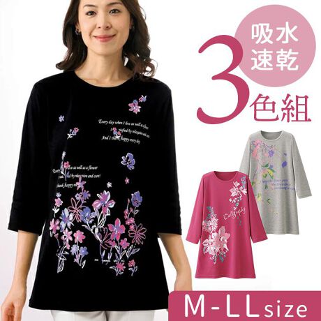 3色セットで着回し十分、7分袖Tシャツ。鮮やかな花柄プリントをデザイン性豊かにあしらったTシャツ。着心地ゆったりサイズでシーズン長く着られる7分袖です。いろんなシーンに大活躍!吸水速乾・接触冷感。