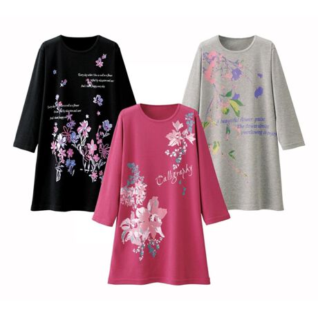 3色セットで着回し十分、7分袖Tシャツ。鮮やかな花柄プリントをデザイン性豊かにあしらったTシャツ。着心地ゆったりサイズでシーズン長く着られる7分袖です。いろんなシーンに大活躍!吸水速乾・接触冷感。