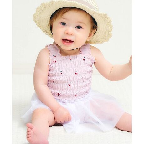 ウエストのチュール付きデザインに注目の水着が登場♪身ごろのシャーリングと、小さめのお花柄やさくらんぼ柄でさらにロマンチックな雰囲気満載に*おそろいの柄のアイテムもあるので、姉妹やおともだちとリンクコーデもオススメです♪
