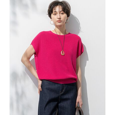 定番のコットンアセテート素材のプルオーバーニット。片畦で編み立てたラウンドボートネックのプルオーバーで、背中のゴールドボタンがさり気ないアクセントに。ゆったりと着られるオーバーサイズシルエットで、幅広い体形をカバー。露出の多くなる夏にうれしいアイテムです。シャリ感のある肌ざわりで、汗をかきやすい真夏も一日中快適に着用できます。どんなボトムとも好相性で着回しやすく、夏のデイリーコーデに欠かせない一枚です。カラーは、目を引くマゼンタ(#011)、ニュアンス感のあるダークグリーン(#065)、フェミニンな印象のラベンダー(#083)のシックな印象のスレート(#504)の4色と、ラメがキラめくライトグレーラメ(#503)、ベージュラメ(#533)の2色の計6色展開です。