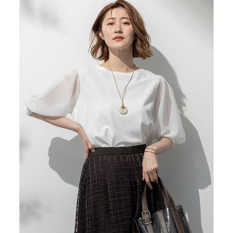 【ニット部分】光沢感があり女性らしいエレガントなドレープ性のあるレーヨンと、適度なストレッチ性のある「ELITE」ポリエステルを撚糸した素材を使用しています。フランス製の「ELITE」は、収縮性にすぐれているため着用時も動きやすくストレスフリー。オンにもオフにも汎用性のある素材感です。 【別布部分】格子状に織り込まれほつれに強いリップストップ生地に立体的な表面感とシアー感を持たせた清涼感のある素材です。肌離れもよく、軽やかな雰囲気を演出します。