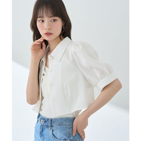 清涼感のあるサマーツイード素材のシャツジャケット。きちんと感のある襟付きデザインにふんわりボリューム袖がフェミニンな華やかさのあるひと品です。トレンドライクに着こなせる短めのレングスも魅力的。半袖タイプでライトに着やすく、夏のきれいめスタイルにおすすめの一枚です。