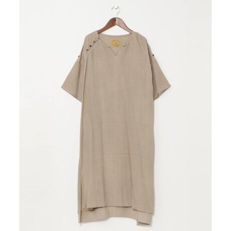 [型番:IDS-5128-2025]風合いの良い麻混素材のビッグシルエット・レディースワンピース。少し後ろが長めになったハイローヘムのシルエットや、バックスタイルの首元に入った刺しゅう、フロントに斜めに入ったボタンなど、シンプルの中にもこだわりをふんだんに詰め込んだ一枚。袖を折るとタブが付いており袖丈の調整も可能。普段使いのしやすい、無駄をそぎ落とした一品。