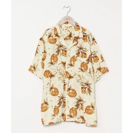 パイナップルやパームツリーなどのハワイアン柄がプリントされたメンズアロハシャツ。表面感のあるドビー織りと薄手で軽やかなレーヨン生地で、暖かい季節に活躍します。単体でも羽織でも使える一枚です。ユニセックスで着用可能。