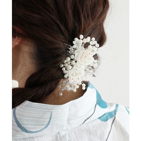 透明感のあるフラワーパーツに、パールとクリスタルビーズを贅沢にあしらった華やかなコーム。