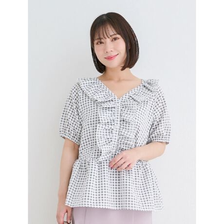 ・ふんわりとしたフリルが装いを華やかに演出するドビーチェックブラウス。