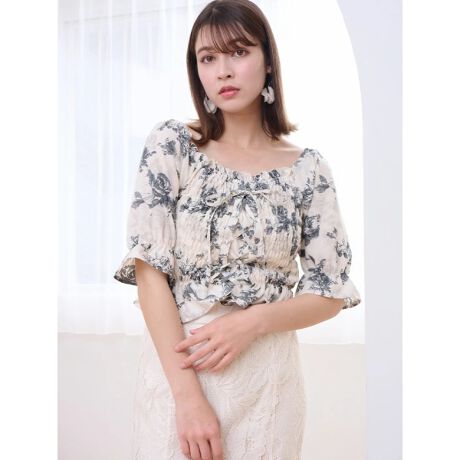 ・くしゅくしゅっとしたシャーリングにレースアップを施した愛らしいプルオーバー。