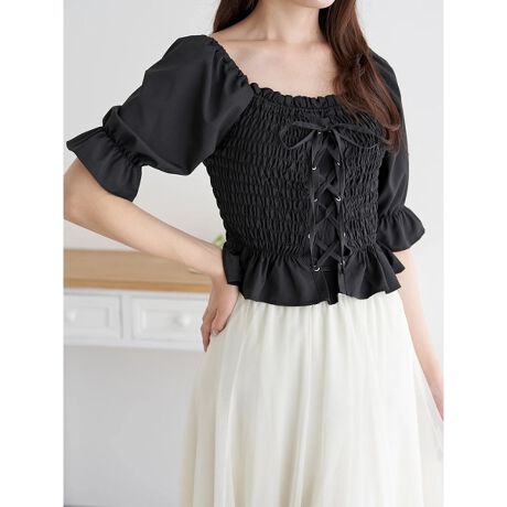 ・くしゅくしゅっとしたシャーリングにレースアップを施した愛らしいプルオーバー。