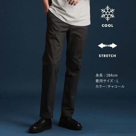 程良くひんやりとする素材感とストレッチ性も兼ね備え、動きやすく夏のビジネスシーンに最適。