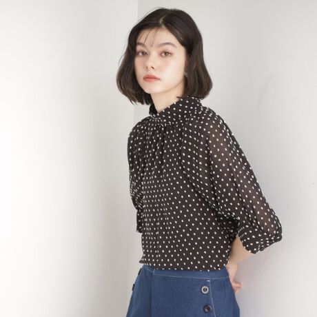 シフォン素材によるシアー感があり、女性らしさを引き立てるスタンドネックデザインとボリューム袖が特徴的。