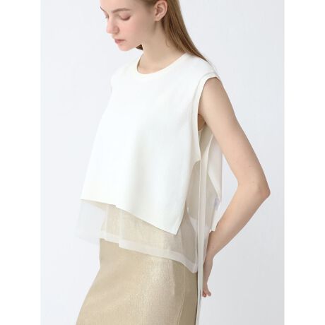 マットな質感のニット地と、シースルー生地のドッキング素材。同じ色味の異なる素材を重ねることで、単色の中にも陰影や凹凸感のある魅力的な表情に。柔らかくさらりとした素材感で、女性らしく軽やかな印象を与えます。
