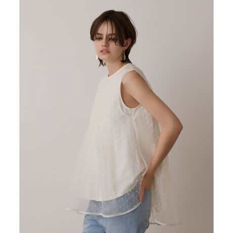 カットソーにシアー感が綺麗なドット柄ジャガード地をレイヤードしたフェミニントップス。 気になるヒップがすっぽり隠れるチュニック丈でお作りした、大人にも嬉しいデザインです。フロントにタックを取り入れつつも、裾が広がりすぎないようバランスに拘り、幼く見えないふんわりとした優しいシルエットを表現しました。そのまま着て頂くのはもちろんの事、中のカットソーだけをインしてチュールを外に出したシアー感をより楽しむ着こなしもおすすめです。