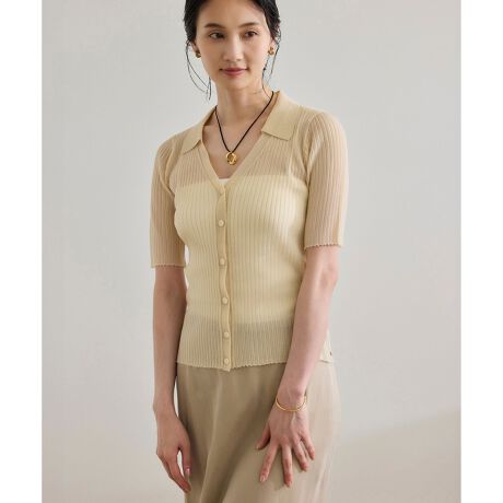 リブ編みにすることで程良い透け感で1枚着使用できるフィット感のある半袖ニットです。Vネックのすっきりした開きにポロ衿をつけています。