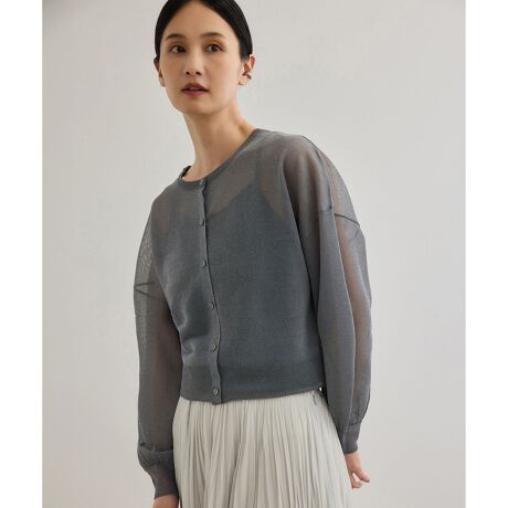 天竺編みの透け感でインナー合わせで前後2WAYに使用できるカーディガンです。ややボリュームをもたせたフェミニンな印象の袖がポイントです。