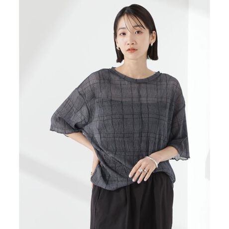 程良い透け感とチェック柄がシーズンムードを高めてくれるシアーTシャツ。ゆるっとしたサイズ感が、女性らしさを惹き立ててくれるトップス。伸縮性のあるカットー素材なので、着心地も良くこれからの季節におすすめの一枚です。