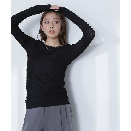 【ヨガインストラクターでインフルエンサーとしても大活躍の麻亜里さん×NBBコラボ企画】レース柄のような表情のあるカットソー素材を使用したプルオーバー。前はすっきりとしたボートネックで、後ろネックはラウンドに開いたバックシャンデザインです。襟ぐりから続くリボンを後ろできゅっと結ぶのがポイント。少し透け感と伸縮性のある素材なのでスポーツインナーウェアにレイヤードしたり、普段着にも着回せます。<素材>柔らかくて伸縮性のあるカットソー素材を使用。レース柄のような表情のある表面感で少し透ける素材感です。<詳細>仕様・開閉なし裏地・なし透け感・ややあり / 光沢・なし / 伸縮性・あり 生地の厚さ・薄手※モデルの着用画像の場合、光の当たり具合により、実際の色味と異なって見えることがございます。色味は、商品単体の画像をご参照ください。