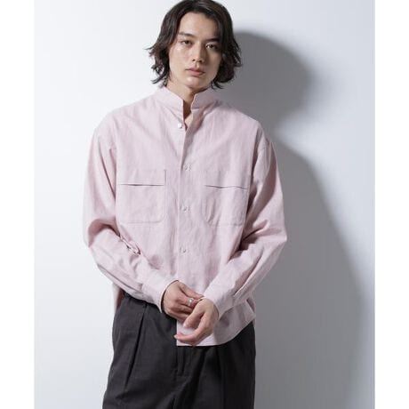 高めのスタンドカラーがエレガントな印象を与えるシャツ。第一ボタンをあえてなくし、程よいリラックス感を持ちながらカチッとしすぎない着こなしが可能なアイテムです。