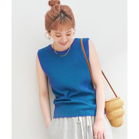 さらりとドライタッチな糸を使用して、2色の糸を表裏で編み分けるプレーティングで両畦編みしたタンクトップ。表と裏で色の出方が異なり、配色とは違った奥行きある見えが特徴です。