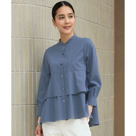 360度美しいシルエットのティアードブラウス■デザイン胸下から緩やかにフレアを出したチュニックブラウスです。フレアの切り替えを2枚重ねのティアードにすることで華やかな印象に仕上げています。ウエストよりも少し高い位置で切り替えることでお腹周りをカバーしてくれます。身頃と袖はややコンパクトにし、着丈に前後差をつけ、後ろに向かってなだらかに長くなる裾がヒップ周りを程よくカバーしつつ、すっきりと見えます。シンプルなパンツに合わせやすいバランスです。■素材細番手で高密度に作られていますが、ソフトな風合いに仕上げた綿100%の素材です。適度なハリがあり、滑らかでしなやかな肌触りです。着用時の透け感があまり気にならないのもポイントです。