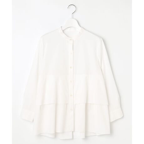 360度美しいシルエットのティアードブラウス■デザイン胸下から緩やかにフレアを出したチュニックブラウスです。フレアの切り替えを2枚重ねのティアードにすることで華やかな印象に仕上げています。ウエストよりも少し高い位置で切り替えることでお腹周りをカバーしてくれます。身頃と袖はややコンパクトにし、着丈に前後差をつけ、後ろに向かってなだらかに長くなる裾がヒップ周りを程よくカバーしつつ、すっきりと見えます。シンプルなパンツに合わせやすいバランスです。■素材細番手で高密度に作られていますが、ソフトな風合いに仕上げた綿100%の素材です。適度なハリがあり、滑らかでしなやかな肌触りです。着用時の透け感があまり気にならないのもポイントです。