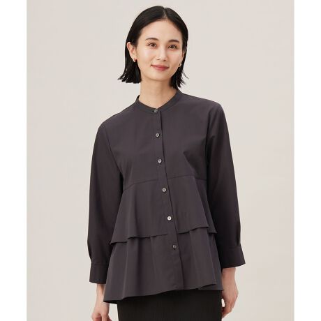 360度美しいシルエットのティアードブラウス■デザイン胸下から緩やかにフレアを出したチュニックブラウスです。フレアの切り替えを2枚重ねのティアードにすることで華やかな印象に仕上げています。ウエストよりも少し高い位置で切り替えることでお腹周りをカバーしてくれます。身頃と袖はややコンパクトにし、着丈に前後差をつけ、後ろに向かってなだらかに長くなる裾がヒップ周りを程よくカバーしつつ、すっきりと見えます。シンプルなパンツに合わせやすいバランスです。■素材細番手で高密度に作られていますが、ソフトな風合いに仕上げた綿100%の素材です。適度なハリがあり、滑らかでしなやかな肌触りです。着用時の透け感があまり気にならないのもポイントです。