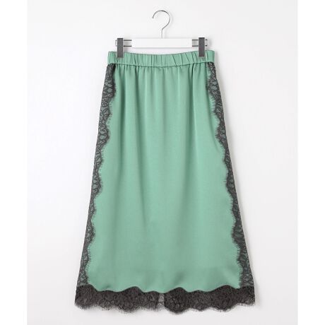 レース×サテン素材が上品で華やかなスカート■デザインすとんと落ちるサテン素材のナロースカートです。裾と脇にスカラップ付きレースを刺繍付けしているデザインが特徴です。1枚でコーディネートの主役になる、エレガントでモードなスカートです。ウエストは総ゴムなので着心地も良く、トップスを選ばず合わせやすい上品なレングスに仕上げています。※モデル画像はサンプルを使用しております。実際にお届けする商品は脇のレースの幅がやや狭くなります。正しい仕様は物画像(モデル画像ではない画像)をご参照ください。■素材表地には異形断面の特殊なポリエステルを使用したサテン素材を使用しております。膨らみ感と落ち感があり、適度なストレッチが特徴の素材です。レースはスカラップの形が特徴的なフラワーモチーフのレースです。