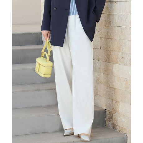 様々なトップスに合わせやすいワイドストレートパンツ■デザインシンプルに大人っぽく仕上げたワイドストレートパンツです。タック方向を内向きにすることで、腰周りがすっきり見えつつ程よいゆとりがあり、足元に向かってすとんと落ちる綺麗なシルエットです。ウエストの前脇から後ろ部分にゴムを入れているので、着心地の良さもポイントです。同素材のジレやトップスとセットアップで着て頂くのはもちろん、シンプルなトップスから華やかなブラウスまで、麻混ならではの素材表情でスタイリングを大人っぽく格上げしてくれます。■素材リネンとポリエステルを交織したストレッチ素材です。リネンならではのナチュラルでドライな表情に、ポリエステルのさらりとした風合いを加えた大人っぽい表情感と肌離れの良い素材です。ストレッチが効いていて着心地が良く、ドライなタッチを残しつつもしなやかでソフトな風合いに仕上げました。■同素材アイテムジレ(VRWMGM0404)ブラウス(BLWMGM0404)