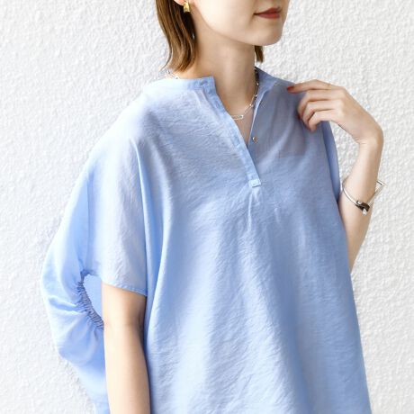 袖口の後ろ部分にゴムを通したギャザーやサイドタック入りでバックにボリューム感のあるシルエットが特徴のニュアンスブラウスです。