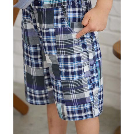 4柄のマドラスチェックをパッチワークしたインド綿のハーフパンツです。涼しさを感じられる春夏らしいアイテムです。