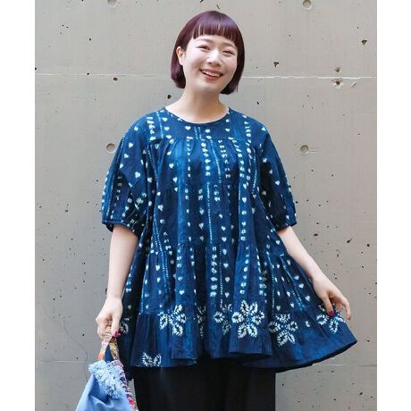 絞り染めのようなグラデーションと控えめなハートが可愛いインド綿のティアードブラウスです。