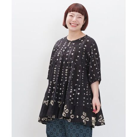 絞り染めのようなグラデーションと控えめなハートが可愛いインド綿のティアードブラウスです。