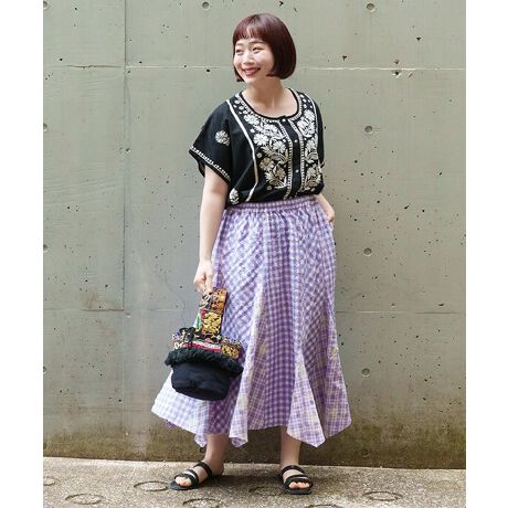 ランダムなひし形のマチが入ったスカートで遊び心溢れる一着に。