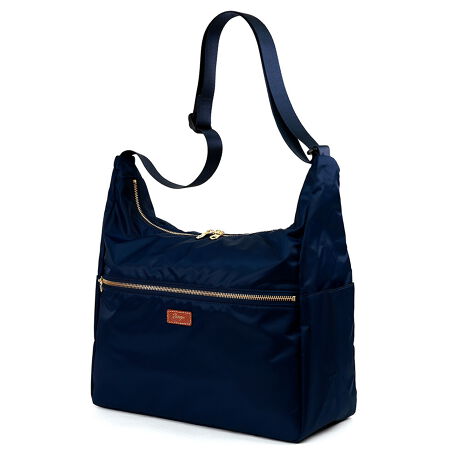 軽量・撥水でシーンを選ばない上質なビッグショルダーです。とても軽く、荷物が多めの人におすすめな大きめサイズが特徴です。メインポケットにはA4サイズ・ランチボックスなども入り、ON/OFF兼用で使えます。小さなお子様連れのお出かけバッグとしてもおすすめのサイズ感です。インナーにはポケットが2つ付いており、小物の整理に役立ちます。外側両サイドには深めのポケットがついており、スマホやペットボトル、折りたたみ傘などが入ります。前側のファスナーポケットには財布やパスケースなど、出し入れの多い小物を入れておくのに便利です。ショルダーベルトは長さの調節ができ、斜め掛けはもちろん、短めに調節すればワンショルダーのスタイルでも合わせることができます。撥水効果のあるテフロン加工のナイロンを使用しているので、雨の日でも安心してお使いいただけます。