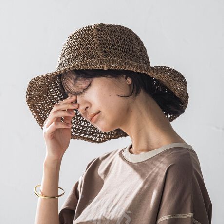 ざっくり編まれた質感が涼し気な、つば広タイプのペーパーハット。