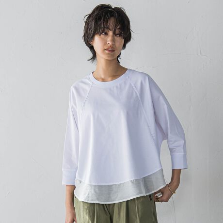 裾には、柔らかくシアー感のあるレーヨン混の布帛を組み合わせました。