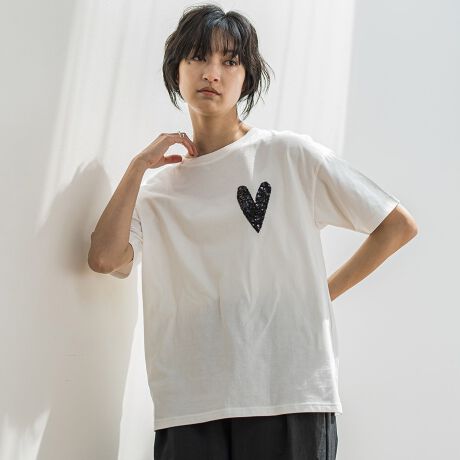 煌めくスパンコールのハートモチーフがポイントのTシャツ。