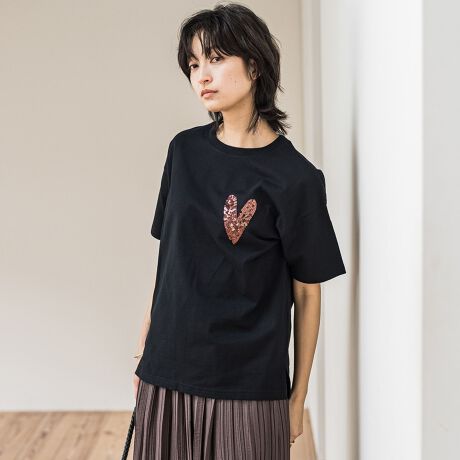 煌めくスパンコールのハートモチーフがポイントのTシャツ。