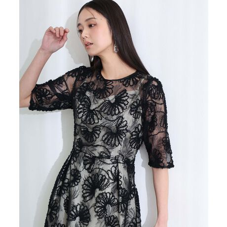 立体感のあるモールレースが華やかさをプラスするミディ丈ドレス。