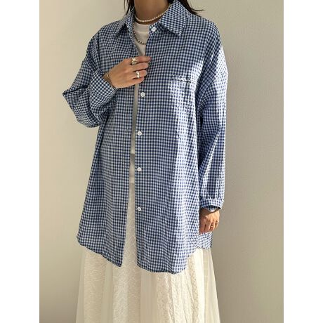 定番のギンガムチェックシャツを後ろ身頃のセンターを大胆にカットし、さらにリボンをあしらったデザインに仕上がっています。裾はラウンドカットなので、ボトムの外に出してラフなスタイリングにしたり、インさせてすっきりしたスタイリングにしてもどちらでもOK。