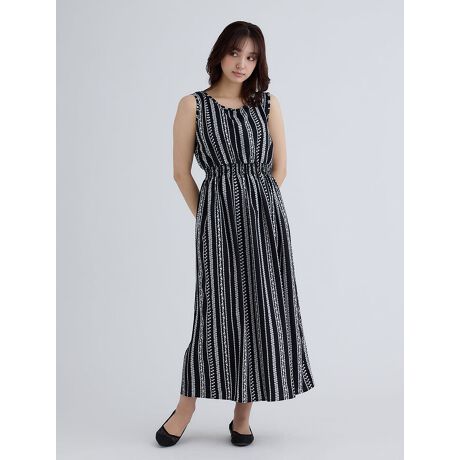 裾に向かって美しく広がるフレアシルエットが女性らしい印象のノースリーブワンピース。ボタニカルな柄がナチュラルさを醸しつつもモノトーン調なので大人っぽさとシックな着こなしが楽しめます。デイリーからお出かけまで、幅広いシーンで活躍してくれるひと品です。