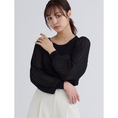 リブ編みのシンプルなボディに、袖部分にふんわりとしたシフォンをドッキングした、女性らしさを引き立ててくれるニットです。シフォンはプリーツ加工が施されており、シンプルななかにもテクスチャーを楽しめる1枚になっています。カジュアルなデニムパンツにもフェミニンなスカートにも合わせやすく、様々なスタイリングが楽しめるアイテムです。
