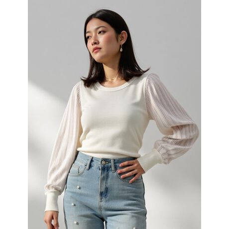 リブ編みのシンプルなボディに、袖部分にふんわりとしたシフォンをドッキングした、女性らしさを引き立ててくれるニットです。シフォンはプリーツ加工が施されており、シンプルななかにもテクスチャーを楽しめる1枚になっています。カジュアルなデニムパンツにもフェミニンなスカートにも合わせやすく、様々なスタイリングが楽しめるアイテムです。