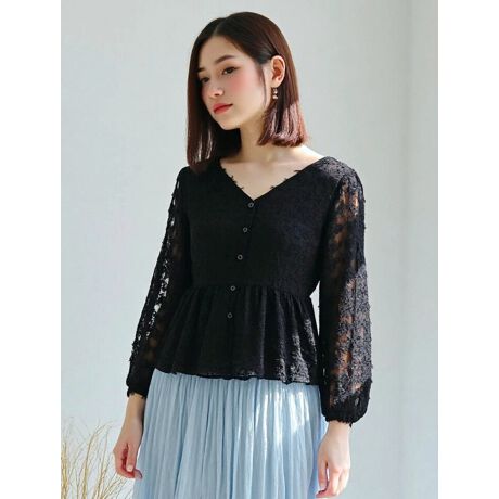 ふわふわとした表面のジャガードが華やかさをプラスし、女性らしさを演出するペプラムVネックブラウスです。裾に向かって広がるペプラムと程よい透け感がやさしい印象を与えてくれます。カジュアルなデニムにもフェミニンなスカートにも合わせやすく、様々なスタイリングが楽しめます。