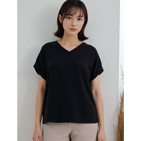 V字に開いたネックラインは首元をすっきりと見せてくれるブラウスです。折り返したデザインの袖口が大人のこなれ感を演出してくれます。合わせるボトムスを選ばず、1枚で着ることがもちろん、ジャケットのインナーなど幅広いスタイリングに活躍するアイテムです。