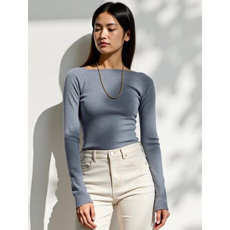 細いリブ編みでフィット感が良く、程よいウエストシェイプなのでウエスト周りが綺麗に見えるラメリブオフショルトップスです。サムホールに親指を通せば萌え袖で着られるのもポイント。さらに保温効果もあって機能的な1枚です。