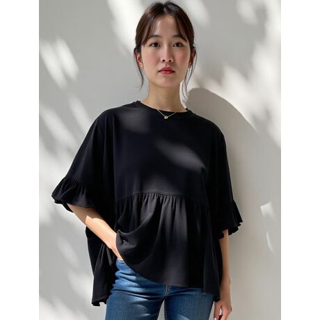 袖と裾にあしらわれた大振りのフリルが魅力のワイドTシャツ。かわいいだけでなく、悩めるお腹問題も簡単にクリアし、二の腕のカバーまでしてくれる頼もしいトップスです。デニムなどのカジュアルボトムからフェミニンなスカートまで相性抜群です。