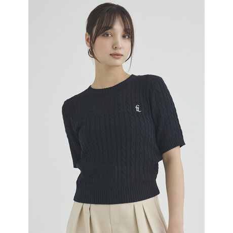 清潔感あるケーブル編みデザインがハンサムな女性の印象のクルーネックニット。胸の刺繍もワンポイントになっています。シンプルなシルエットなので、デニムなどのカジュアルボトムからフェミニンなスカートまで、様々なコーデと相性抜群です。