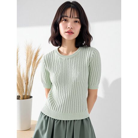 清潔感あるケーブル編みデザインがハンサムな女性の印象のクルーネックニット。胸の刺繍もワンポイントになっています。シンプルなシルエットなので、デニムなどのカジュアルボトムからフェミニンなスカートまで、様々なコーデと相性抜群です。