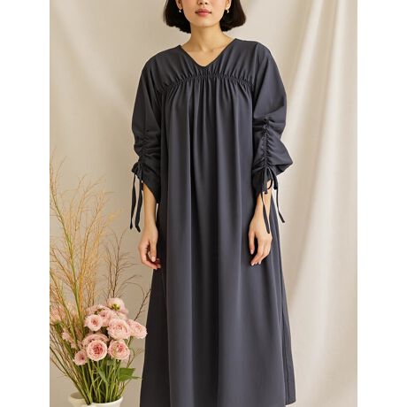 袖のリボンで寄せられたシャーリングスリーブが女性らしい印象を与えてくれるデザインワンピースです。ふんわりしたシャーリングスリーブなので腕が細見えしそうなうれしい効果も期待できそう。これからの季節にぴったりの1枚です。